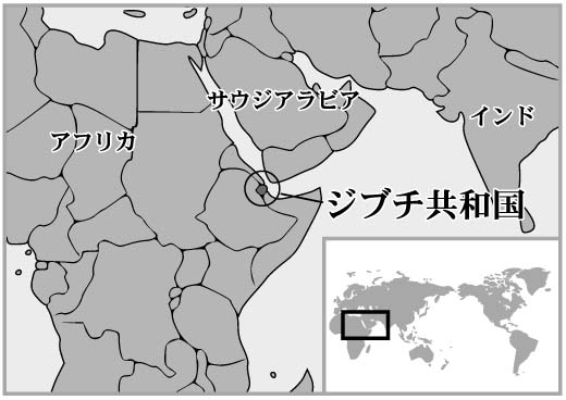 【ジブチ共和国の概要】 アフリカの北東部人口約85万人、大きさは四国の約1.2倍、国民のほとんどはイスラム教徒という小さな国です。最近では日本の海上自衛隊の海賊退治の派遣基地として知られています。国土の大半は沙漠か半砂漠で、夏の気温は50度を超えることもあります。周辺諸国からの難民・避難民を受入れているため、経済的にも厳しく、多くの支援を必要としています。 |
